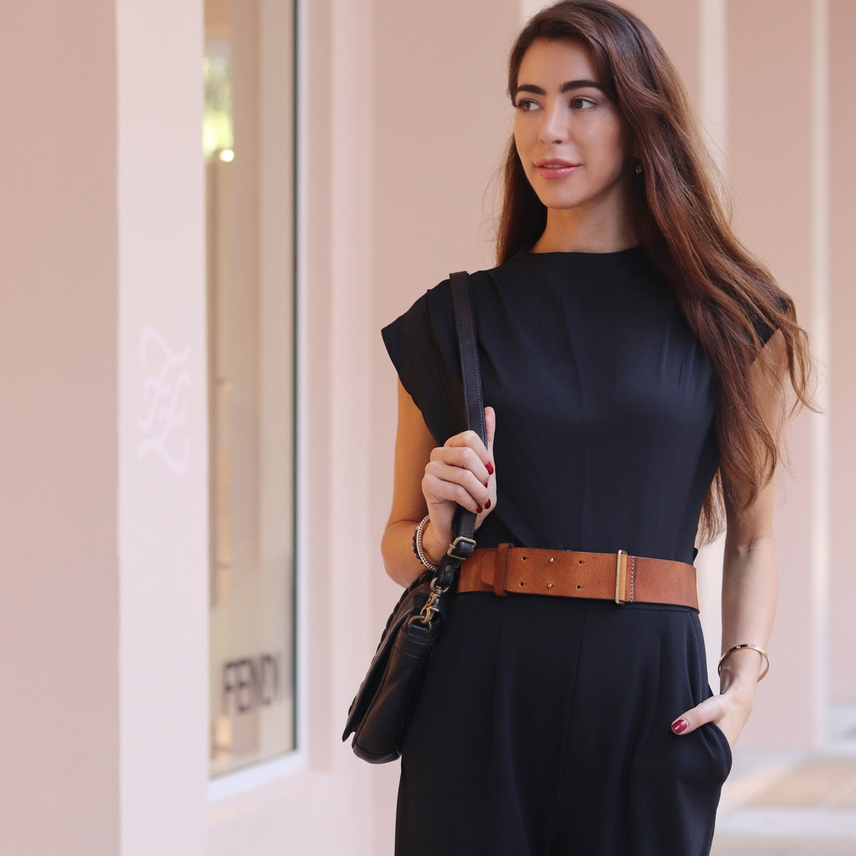 For a bold statement, cinch a loose-fitting casual dress or a classic black jumper with the Vera wide leather belt at the waist to create definition and add a touch of sophistication.