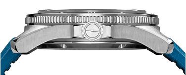 The sandblasted matte blue dial features multi-layer C3 lum stripe indexes. Semi-matte alabaster hands feature C3 lum. A pop of teal on the stripe indexes matches the seconds hand, which is accentuated by a shiny yellow tip.